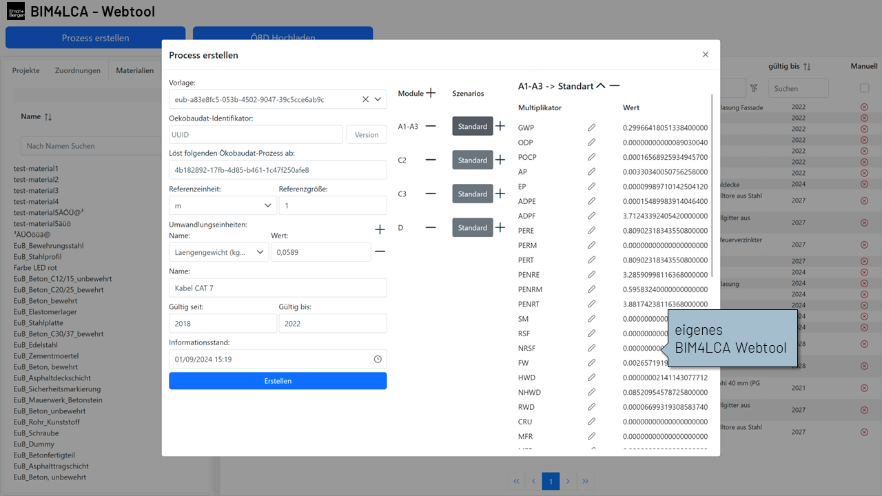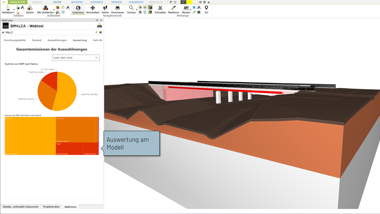Wir entwickeln deshalb das Thema der modellbasierten Nachhaltigkeitsbewertung aktiv mit. Unser derzeitiger Fokus liegt dabei auf der modellbasierten Ökobilanz, also der lebenszyklusumfassenden Analyse bauwerksbezogener Umwelteinwirkungen, wie z.B. von Treibhausgasemissionen oder dem Ressourcenverbrauch. Aus den digitalen Bauwerksmodellen werden dabei Baustoffmassen extrahiert und über eine eigene API-Schnittstelle mit Datensätzen aus Umweltdatenbanken referenziert. Die Berechnungsergebnisse der jeweiligen Nachhaltigkeitskriterien werden anschließend auf Plausibilität geprüft und z.B. bei Variantenvergleichen eingesetzt.
