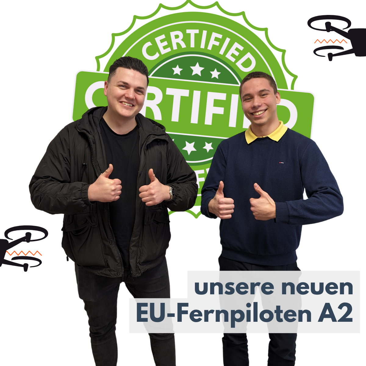 Wir freuen uns berichten zu können, dass unsere Kollegen Sergej (links) und Martin (rechts im Bild) ihre Ausbildung zu Drohnenpiloten (EU-Fernpiloten A2) erfolgreich absolvieren konnten.